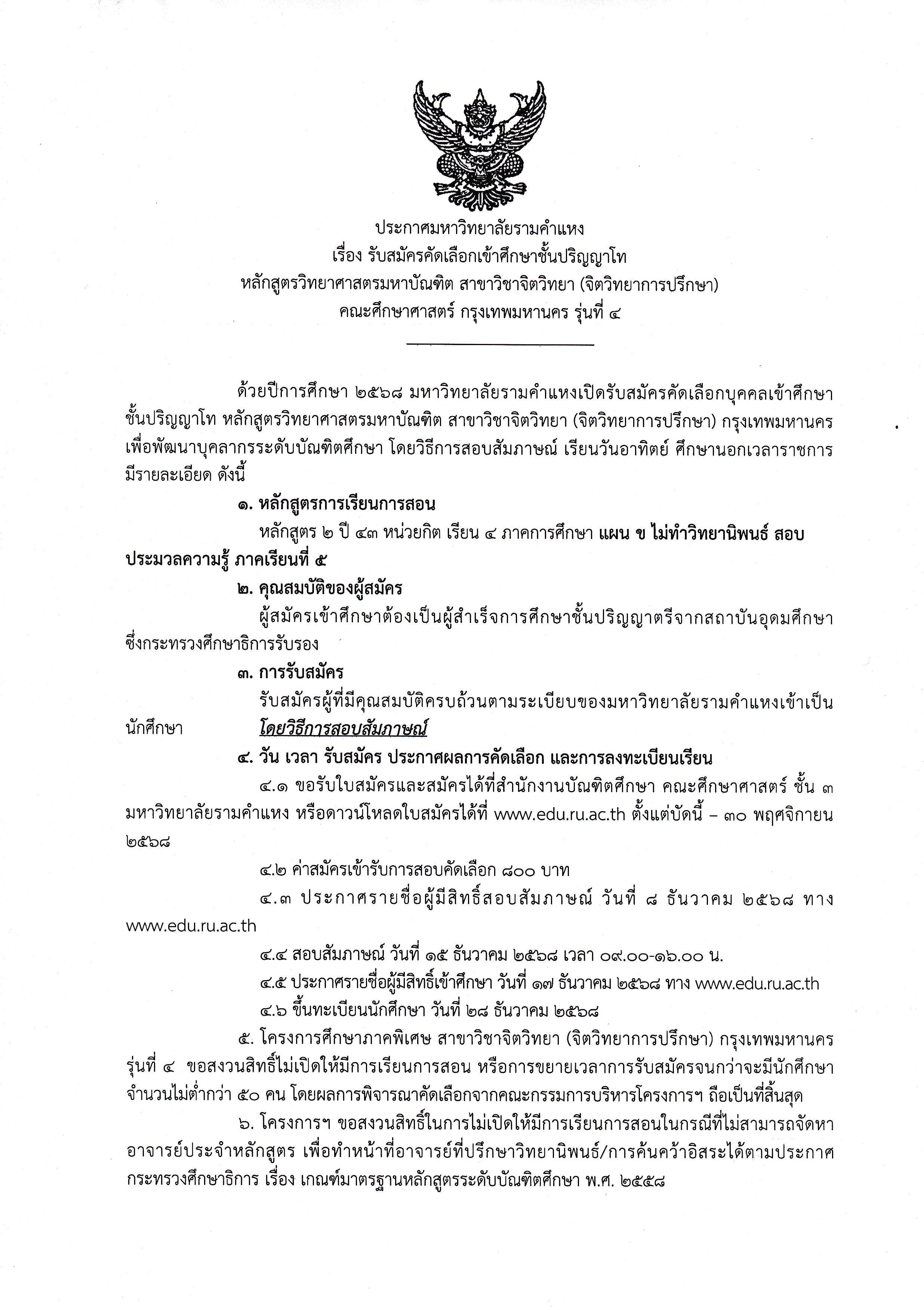 รับสมัครเข้าศึกษาระดับปริญญาโท โครงการศึกษาภาคพิเศษ หลักสูตรวิทยามหาบัณฑิต สาขาวิชาจิตวิทยา (วิชาเอกจิตวิทยาการปรึกษา) กรุงเทพมหานคร รุ่นที่ 4